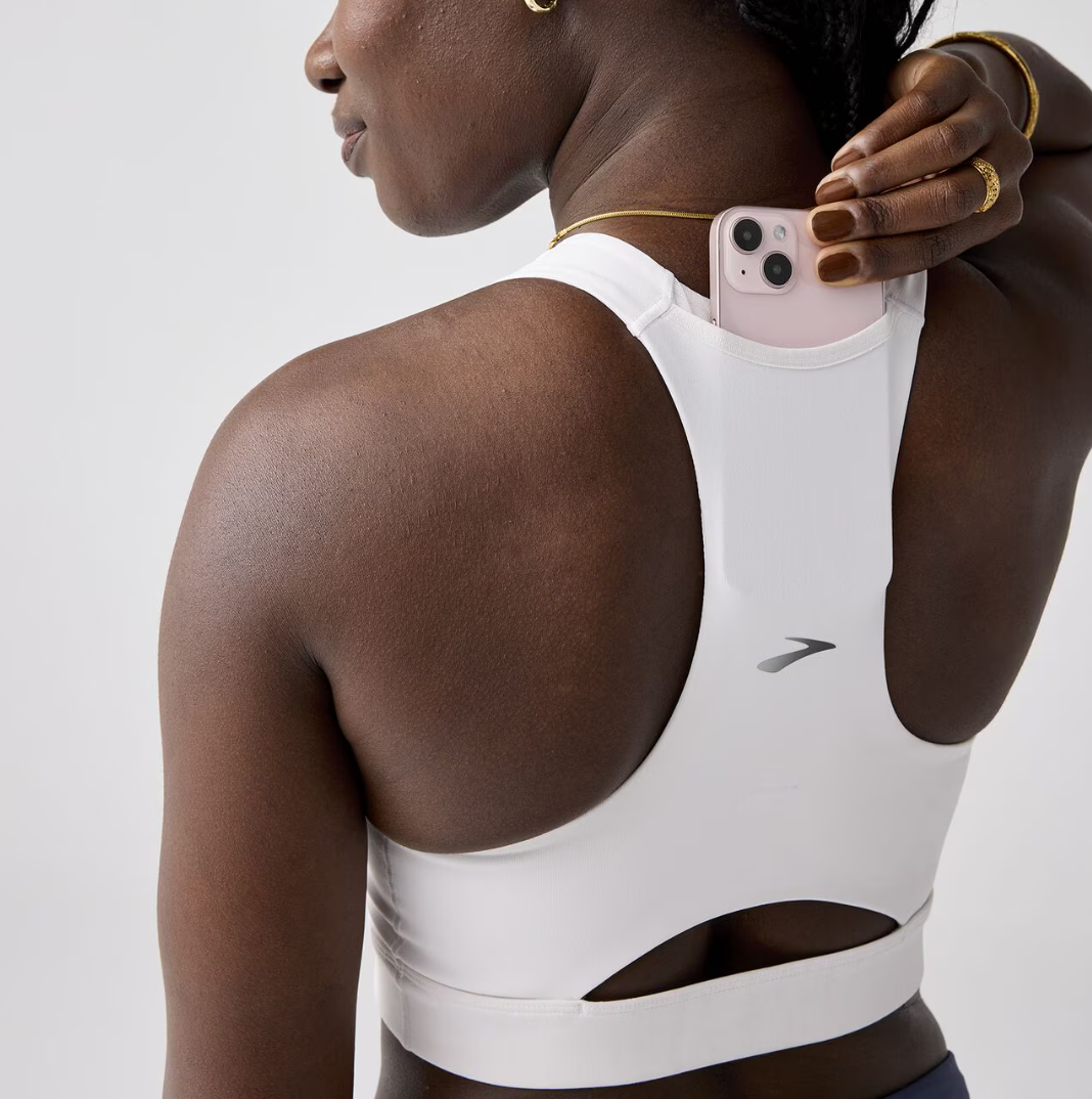 Supportive yet soft this Brooks sports bra is designed for comfort when you're on the move. A large pocket on the back can fit a phone or nutrition so you can keep your hands free for your run.